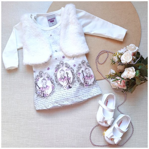 Vestido em suplex estampado com bolero em pelúcia