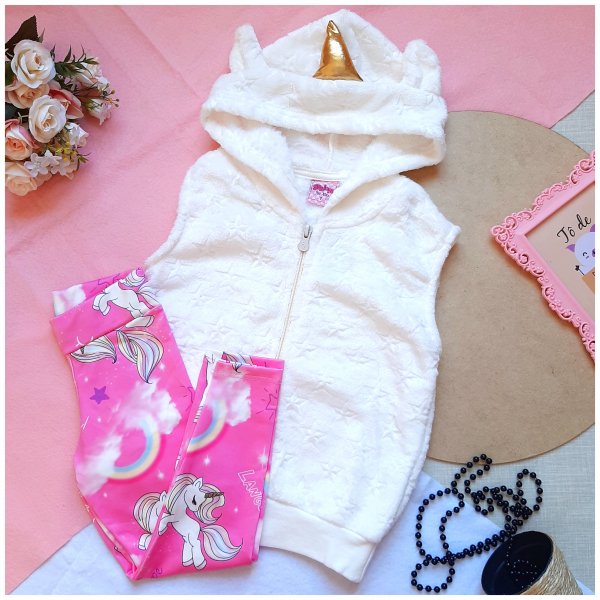 Colete com orelhas e chifre de unicórnio e calça estampada em suplex
