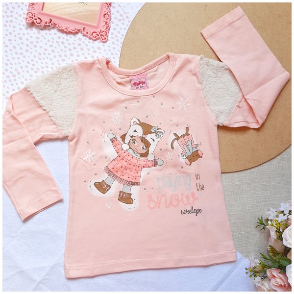 Blusinha em cotton com detalhe peluciado nas mangas e estampa