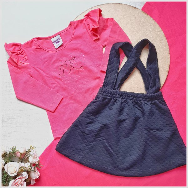Blusinha pink em cotton com aplicação de strass e salopete preta em matelassê.