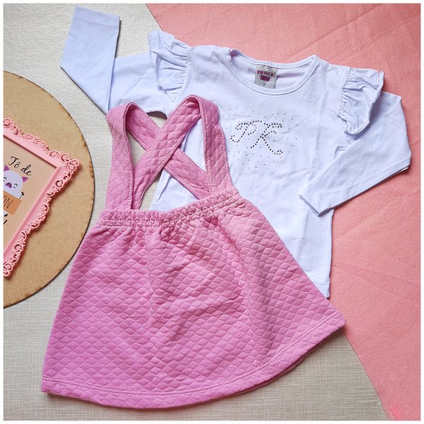 Blusinha em cotton com aplicação de strass e salopete em matelassê.