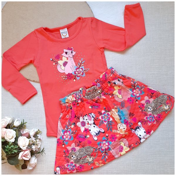 Body em cotton com estampa e aplicação de strass e saia em matelassê estampado